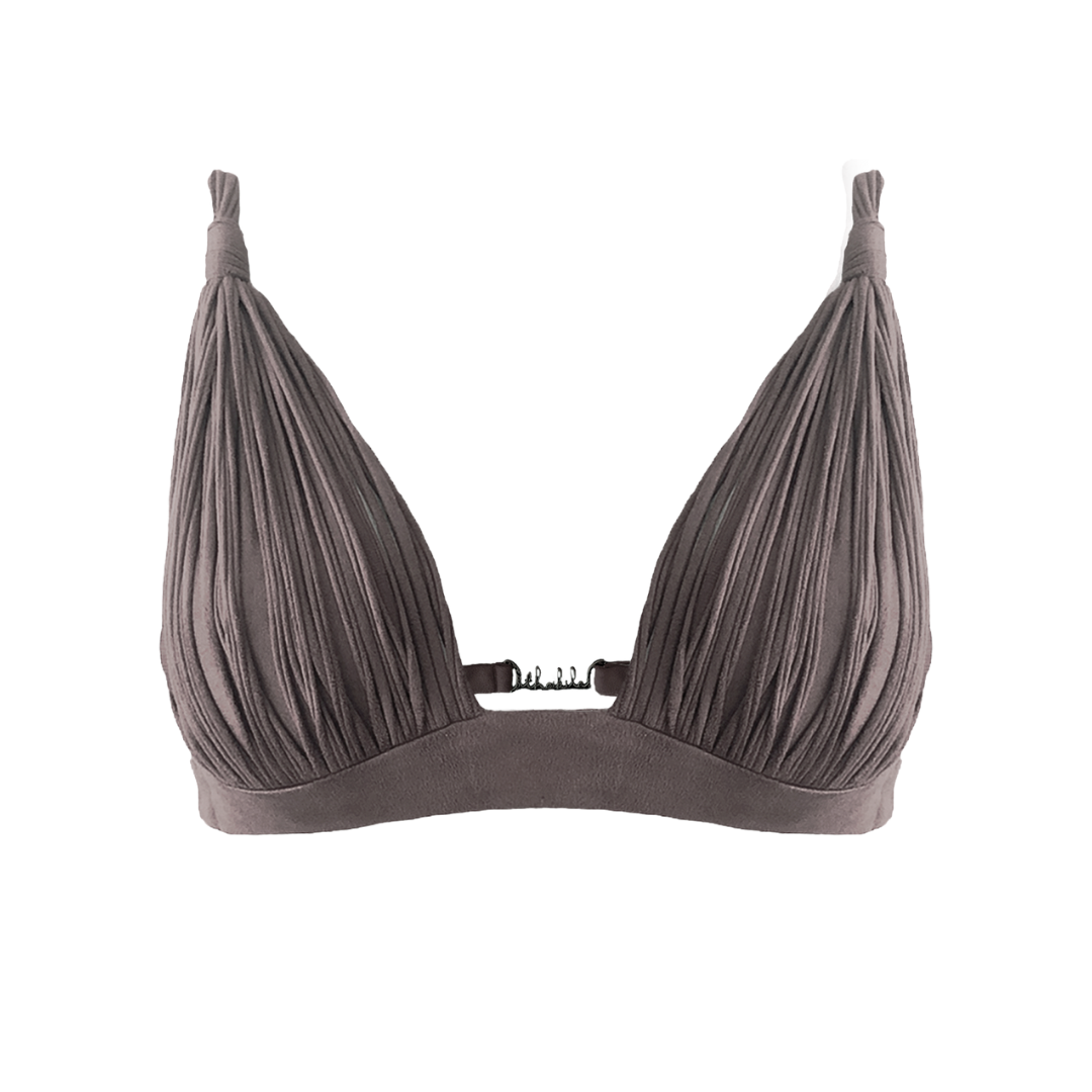 Cut with a seductive wide-V front, these bottoms are shaped in our ‘cheeky’ back coverage. Ornamented with shells in lieu of side straps, this style is reversible with the option to expose the shells' exterior amber-brown hues or interior silver surfaces with an opaline complexion.