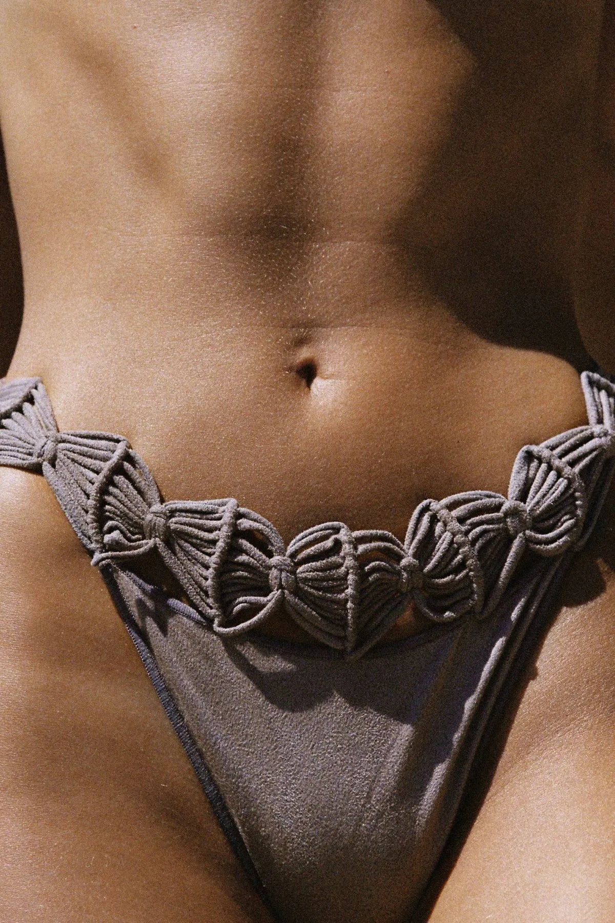 Embracing your curves with our ‘Cheeky’ back coverage, these unique bottoms are patterned with geometric diamonds within a wide band of hand-knotted macramé.