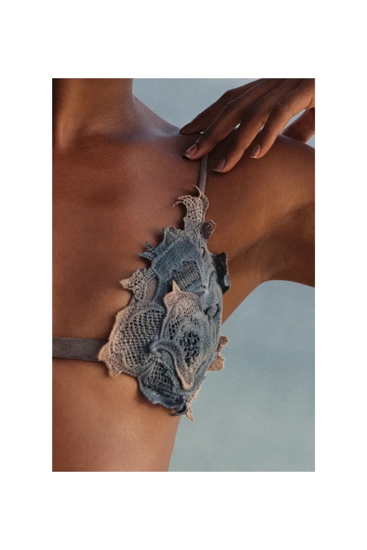 - Lace embroidery hand-dyed in hues of grayish blue